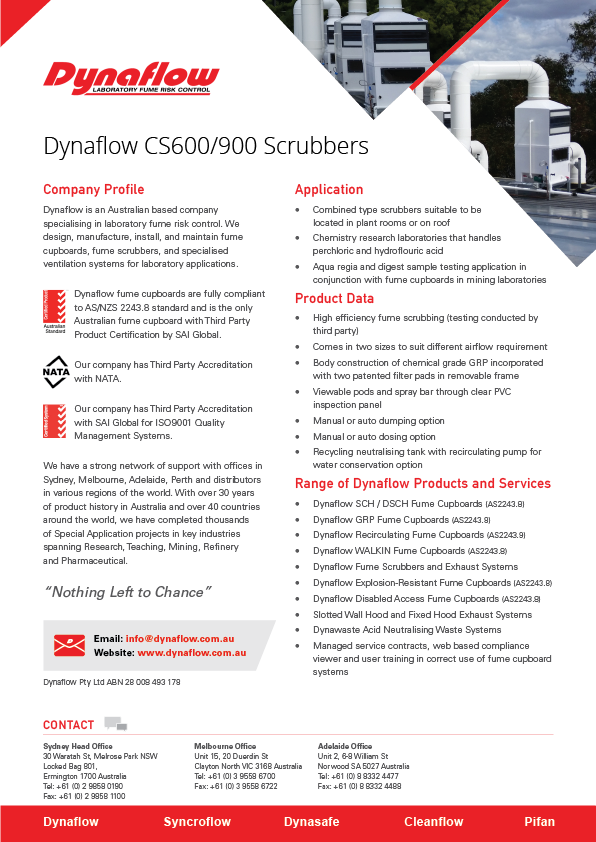 Dynaflow is an Australian based company specialising in laboratory fume risk control. We design, manufacture, install, and maintain fume cupboards, fume scrubbers, and specialised ventilation systems for laboratory applications.