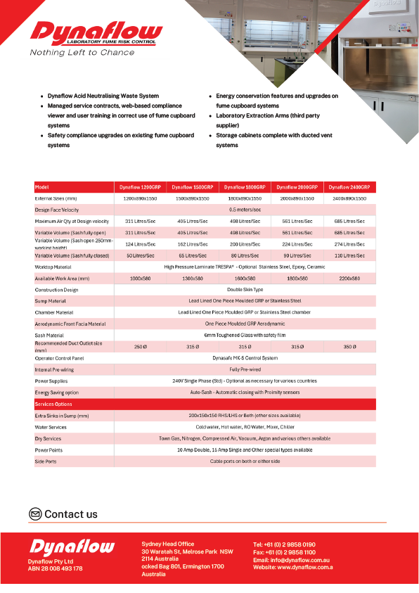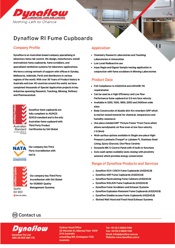 Dynaflow is an Australian based company specialising in laboratory fume risk control. We design, manufacture, install, and maintain fume cupboards, fume scrubbers, and specialised ventilation systems for laboratory applications.