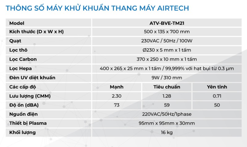 Thông số kỹ thuật của Máy khử khuẩn Thang máy AIRTECH
