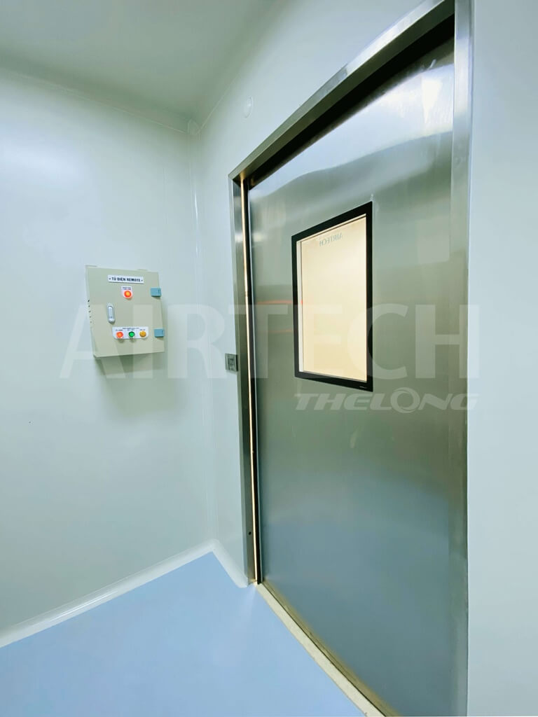 Cửa tự động trượt 1 cánh của Airtech Thế Long không chỉ thuận tiện mà còn giúp duy trì áp suất không khí trong phòng đệm. Cửa được trang bị cảm biến hiện đại, tự động mở và đóng khi có người đi qua, giảm thiểu tối đa sự xâm nhập của bụi bẩn từ bên ngoài.