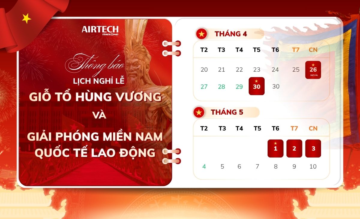 Hòa chung không khí hân hoan chào mừng các ngày đại lễ lớn của dân tộc, Công ty Cổ phần Airtech Thế Long xin trân trọng thông báo lịch nghỉ lễ Giỗ Tổ Hùng Vương và 30/4 - 1/5 năm 2026 như sau: